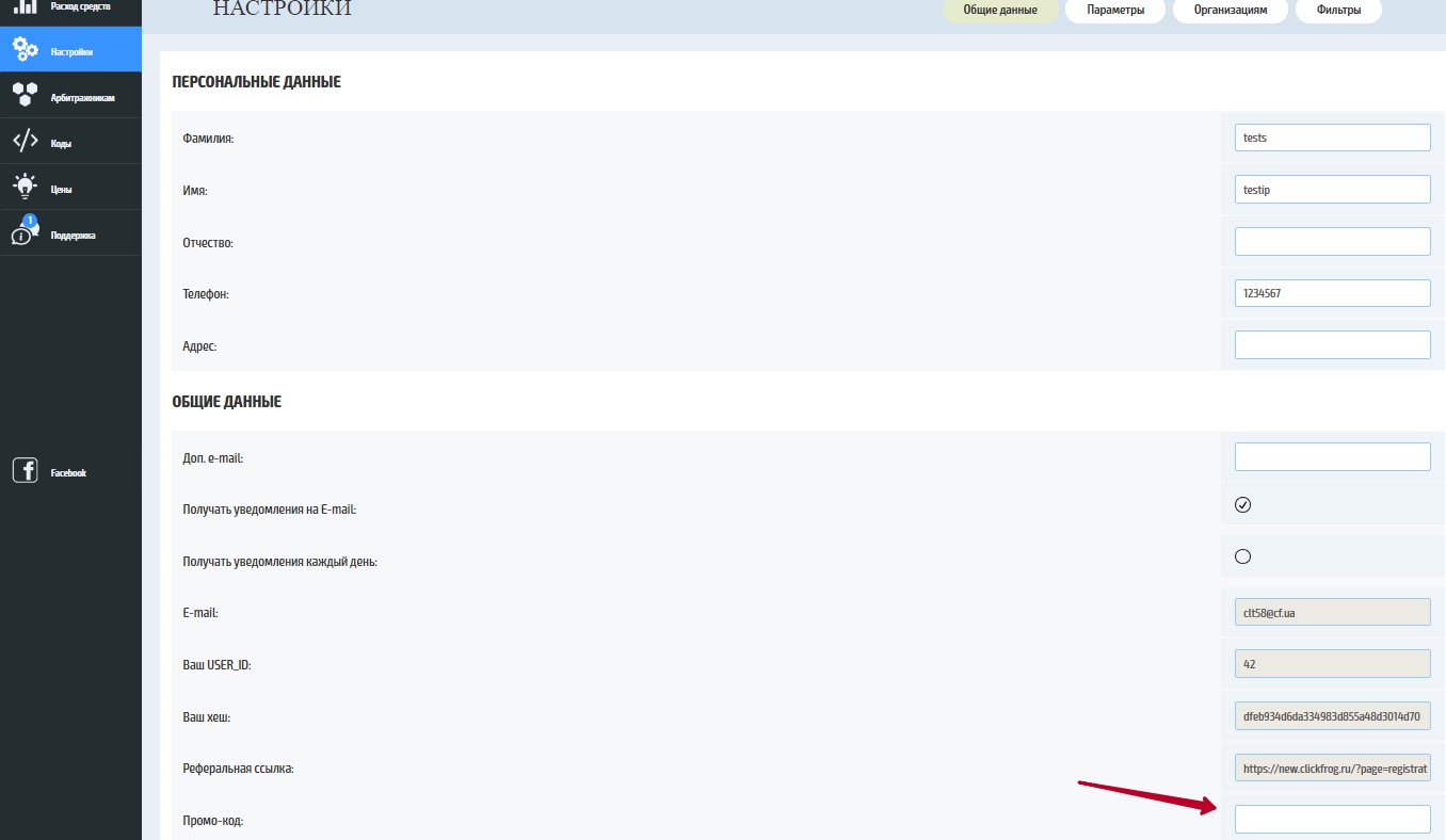 Промо-кода вносятся в разделе «Настройки». Промо-код действителен только на одно пополнение.