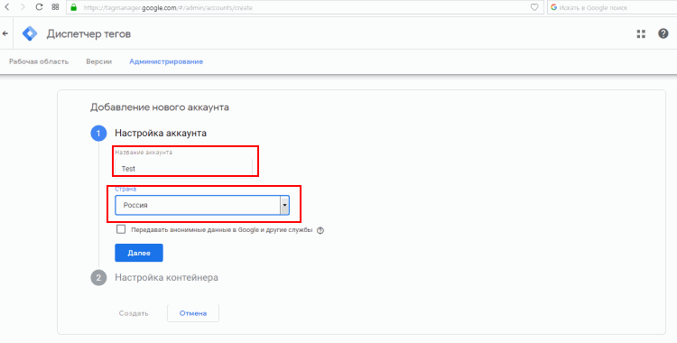 В открывшемся окне указать "Название аккаунта" и "Страну", нажать кнопку "Далее"