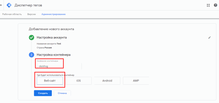 Указать настройки контейнера "Название" и выбрать "Веб сайт" в пункте "Где будет использоваться контейнер", нажать кнопку "Создать"