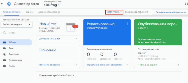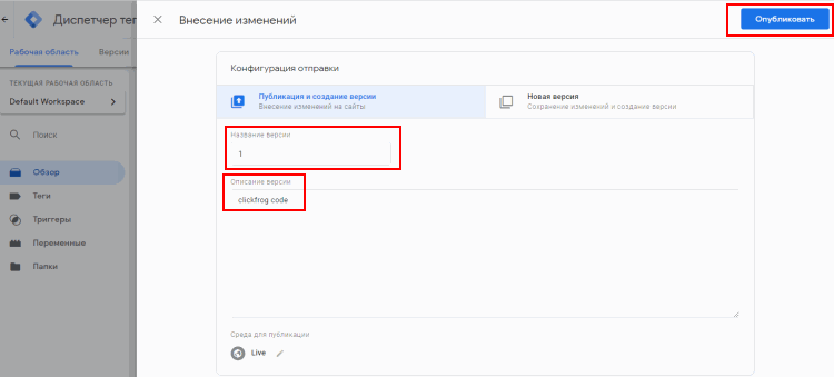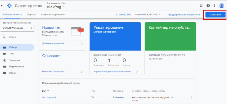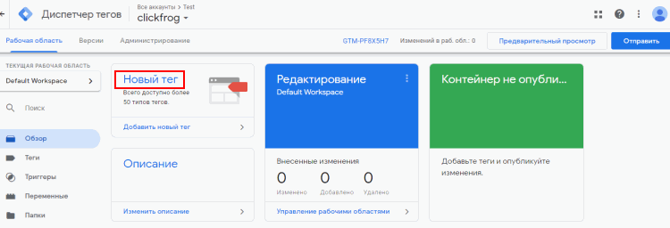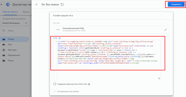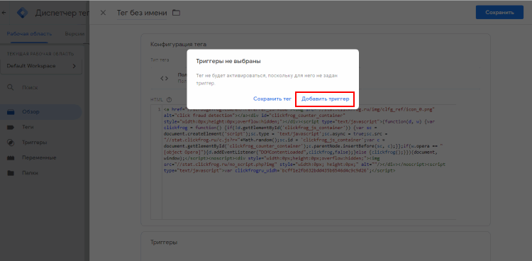 После этого пападаем на страницу создания тег, обратите внимание что на странице должен быть код Clickfrog и триггер "All Pages", нажимаем кнопку "Сохранить"