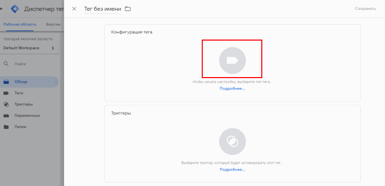 Откроется окно создания тега, в которм нужно кликнуть на "Конфигурацию тега"