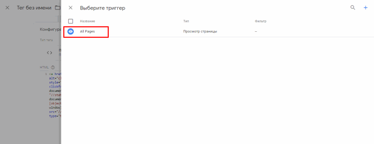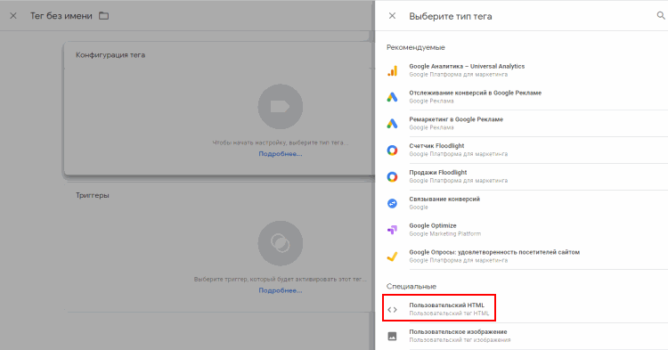 Далее в Выборе тега, выбираем "Пользовательский HTML"