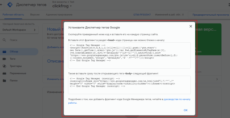 Для установки кода через вам необходимо перейти в свой аккаунт tagmanager.google.com