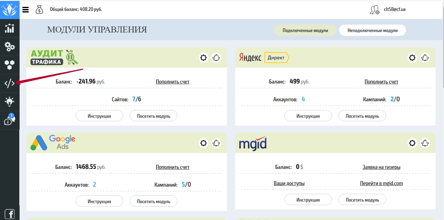 5) Пополните общий баланс системы и переведите с него деньги на баланс модуля "Аудит трафика"