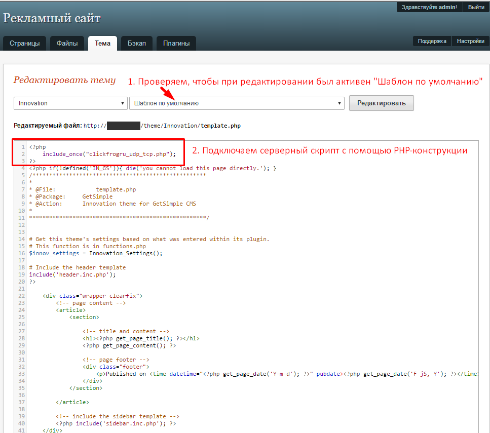 Далее сохраняете изменения и перезаливаете страницу. С помощью любого браузера вам нужно зайти на страницу и посмотреть ее исходный код. Если в исходном коде страницы, на которую вы подключили скрипт, строка <?php include_once 'пусть к php скрипту'; ?> не видна, значит у вас обрабатываются сценарии php, и скрипт подключен правильно. Кроме этого, работоспособность скриптов вы можете проверить на вкладке "Проверка кода" внутри аккаунта. Если же строка видна, значит сценарии php не выполняются. Чтоб настроить их выполнение, вы можете попробовать прописать в .htaccess строки