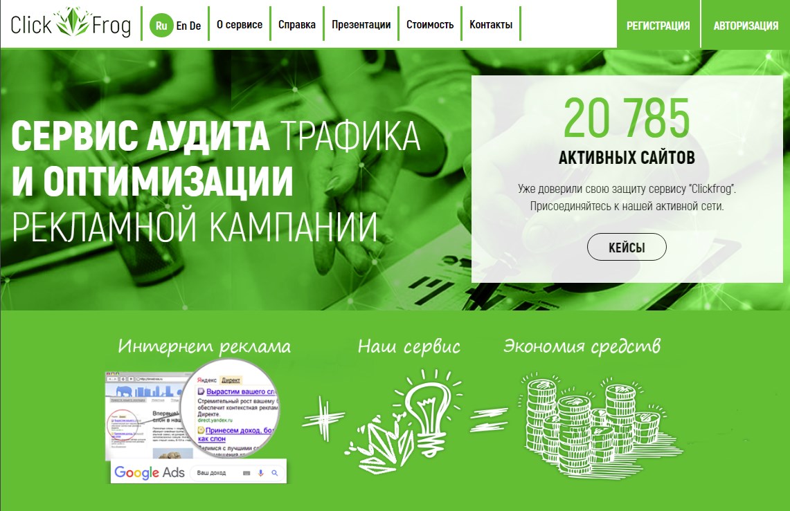 Сервис ClickFrog™ был разработан в целях аудита трафика и повышения эффективности контекстной рекламы, снижения уровня кликфрода в Рунете и тем самым очищения трафика, за который рекламодатель платит деньги. ClickFrog™ нацелен на экономию рекламного бюджета путем блокировки показа рекламы пользователям, чьи переходы являются мошенническими и отказа от площадок, которые приносят на рекламируемый сайт нецелевой трафик. Так же ClickFrog™ может помочь разобраться, куда именно уходит рекламный бюджет и есть ли от этого отдача. Можно размещать рекламу на разных источниках по множеству ключевых слов, а получать реальных клиентов только из одного-двух регионов по одному источнику, и только по десятку ключевиков. Сервис способен это детально проанализировать.
