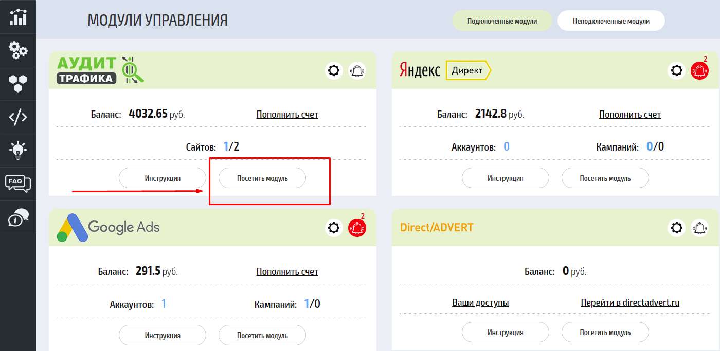 6) Пополните общий баланс системы и переведите с него деньги на баланс "Аудит Яндекс Директ"/"Аудит Google.Ads"