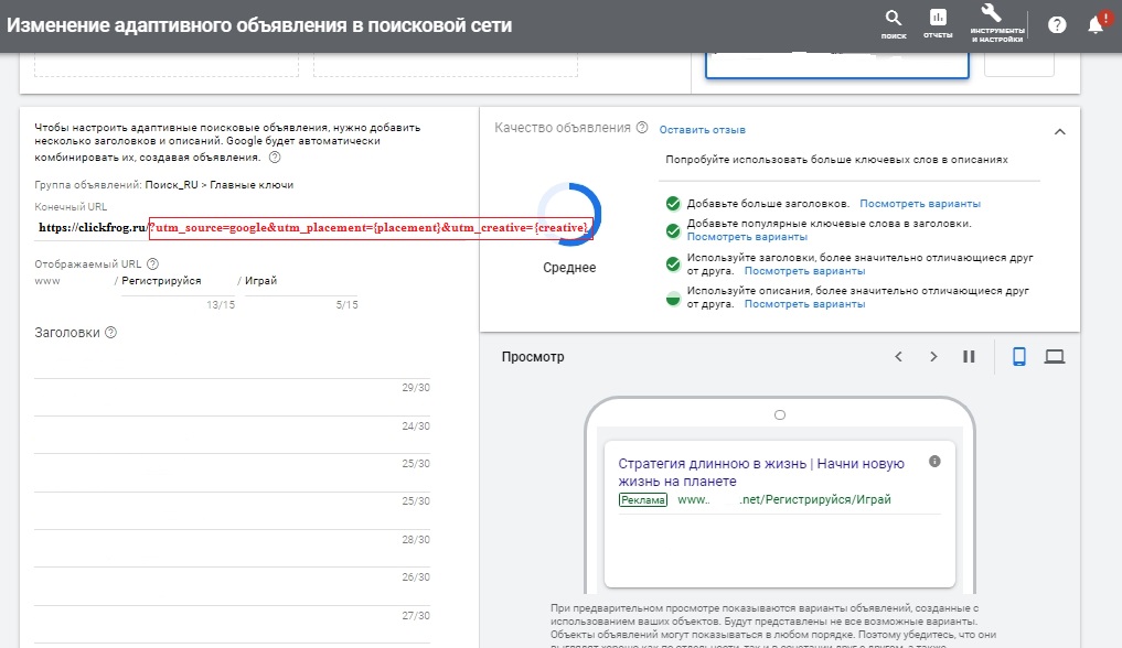 Для настройки бана на уровне кампаний и площадок в модуле "Аудит Google Ads" вам необходимо для всех обьявлений добавить UTM разметку пользователя и задать значение параметров - utm_source, utm_placement и utm_creative. Для этого необходимо отредактировать обьявление и добавить в адрес целевой страницы (параметр "Целевой URL") три метки utm_source, utm_placement и utm_creative в конец ссылки следующим образом: utm_source=google&utm_placement={placement}&utm_creative={creative}, как показано на рисунке: