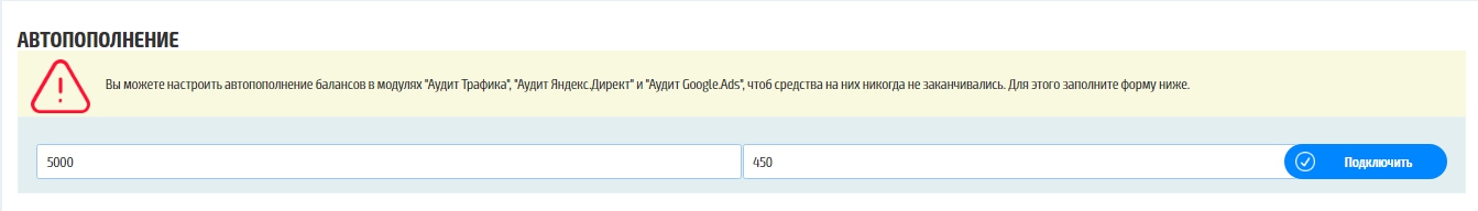 Автоплатеж позволяет не останавливать работу модулей Аудит трафика, Аудит Директ + бан, Аудит Google ads + бан, когда на балансе заканчиваются средства. При подключении автоплатежа баланс активных модулей будет пополняться на сумму, которую вы укажите при настройке, если на балансе модуля остается меньше 100р. Если у вас подключено несколько модулей, списание будет происходить по каждому их них.