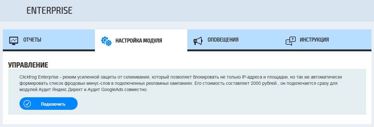Для того, чтобы использовать расширение Enterprise вам нужно кликнуть в левом меню по пункту "Clickfrog Enterprise" и нажать кнопку "Подключить".